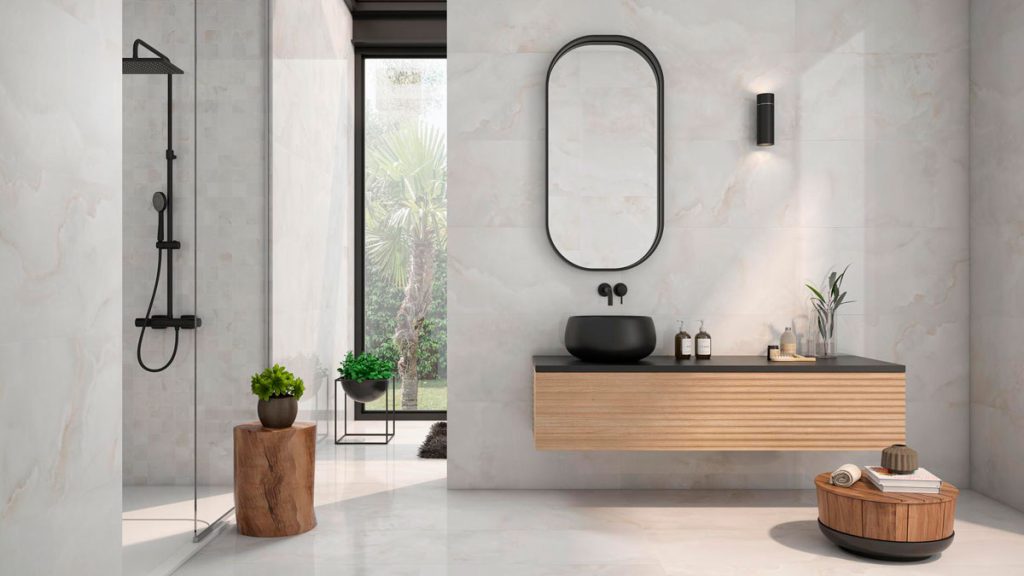 El baño es uno de los lugares donde los azulejos imitación a mármol muestran todo su potencial. Combinan la belleza clásica del mármol con las ventajas técnicas del porcelánico, aportando resistencia a la humedad, fácil limpieza y alta durabilidad.